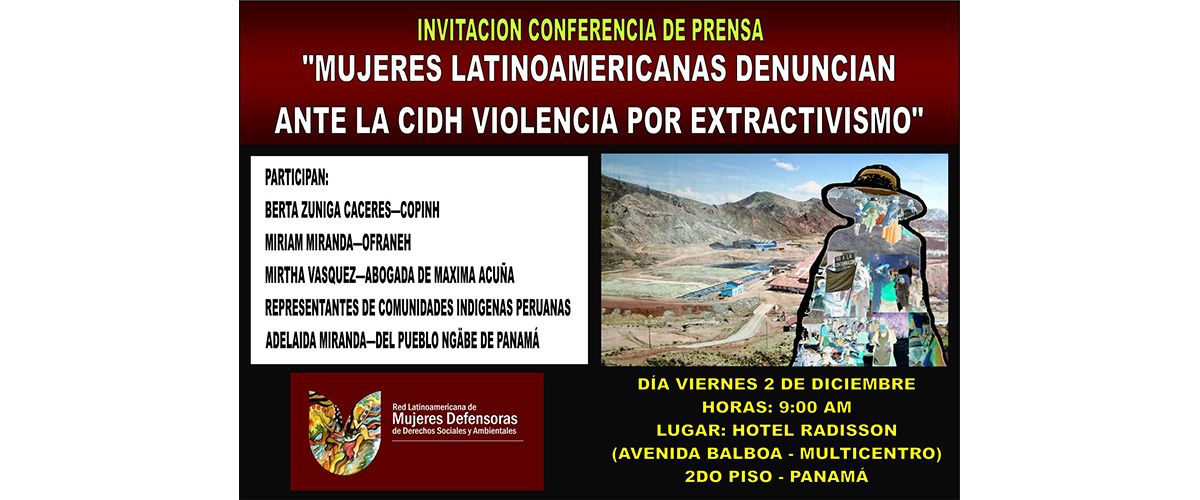Destacar que nos llama la atención que los casos de las mujeres panameñas agredidas por proyectos extractivos no hayan sido incluidos en esta importante sesión de la CIDH. Por las razones expuestas la Red Latinoamericana de Mujeres Defensoras quiere dar voz a las mujeres panameñas junto a defensoras de Ecuador, Perú, El Salvador, Honduras para denunciar la profundización de las agresiones que el extractivismo, minero, petrolero, hidroeléctrico sigue generando, con la complicidad de los Estados, en la vida de las mujeres.